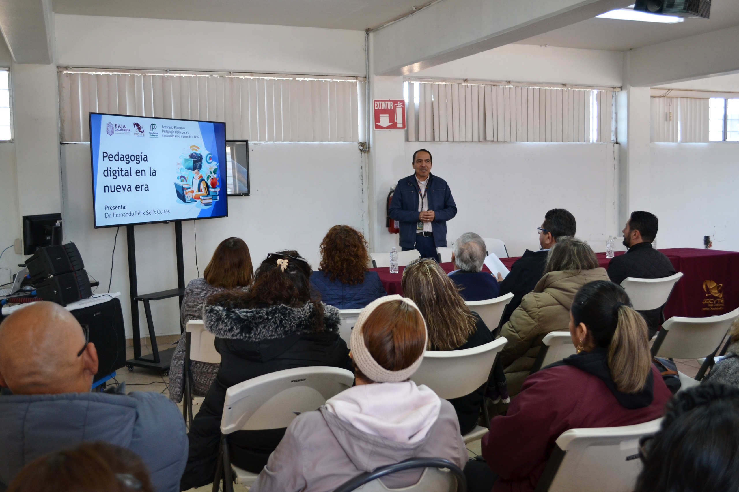 MEXICALI.– Con el compromiso de impulsar prácticas docentes innovadoras y fortalecer la calidad educativa, la comunidad educativa del plantel Xochimilco del Colegio de Estudios Científicos y Tecnológicos de Baja California (CECyTE BC) está llevando a cabo el Seminario Educativo “Pedagogía digital para la innovación en el marco de la Nueva Escuela Mexicana”, en coordinación con especialistas de la Facultad de Pedagogía e Innovación Educativa (FPIE) de la Universidad Autónoma de Baja California (UABC).