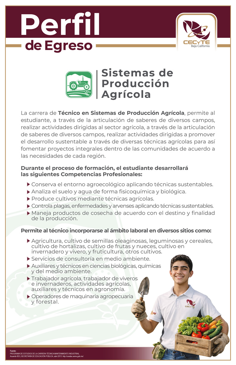 La carrera de Técnico en Sistemas de Producción Agrícola, permite al estudiante, a través de la articulación de saberes de diversos campos, realizar actividades dirigidas al sector agrícola, a través de la articulación de saberes de diversos campos, realizar actividades dirigidas a promover el desarrollo sustentable a través de diversas técnicas agrícolas para así fomentar proyectos integrales dentro de las comunidades de acuerdo a las necesidades de cada región.
