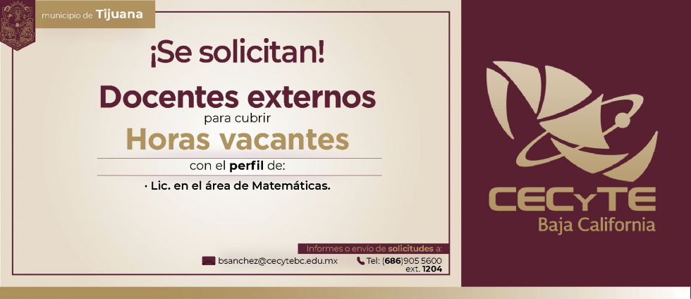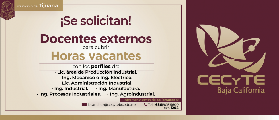 Vacante Docente para: Profesor "Titular A" 3/4T (30 hrs.), Profesor Cecyt I Plantel Playas de Tijuana. Tijuana B.C. Consulta aquí la convo...