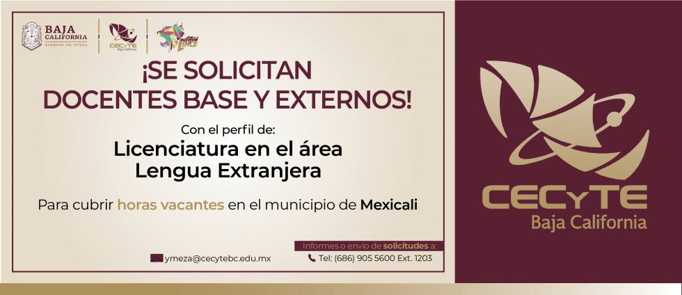 Con el perfil de: Licenciatura en el área Lengua Extranjera para cubrir horas vacantes en el municipio de Mexicali...