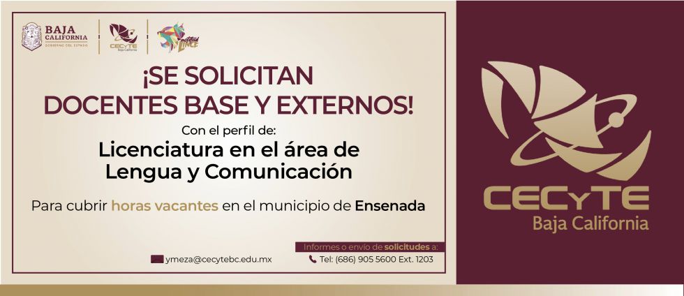 Con el perfil de: Licenciatura en el área de Lengua y Comunicación para cubrir horas vacantes en el municipio de Ensenada...